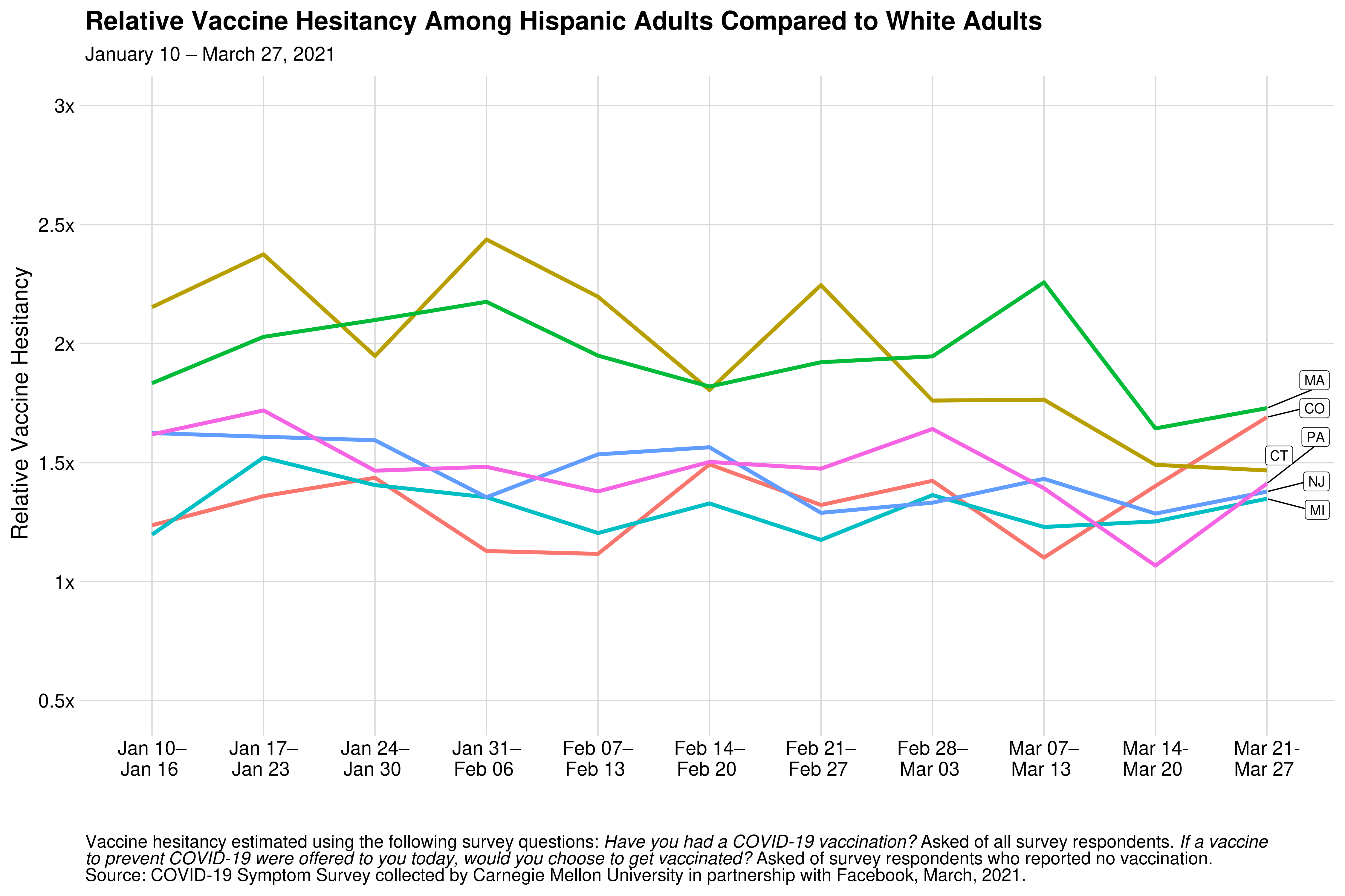 Fortunately, the disparity in vaccine hesitancy in many of these states (including MA, CO, PA, CT, NJ, and MI) is either decreasing or stable over time: