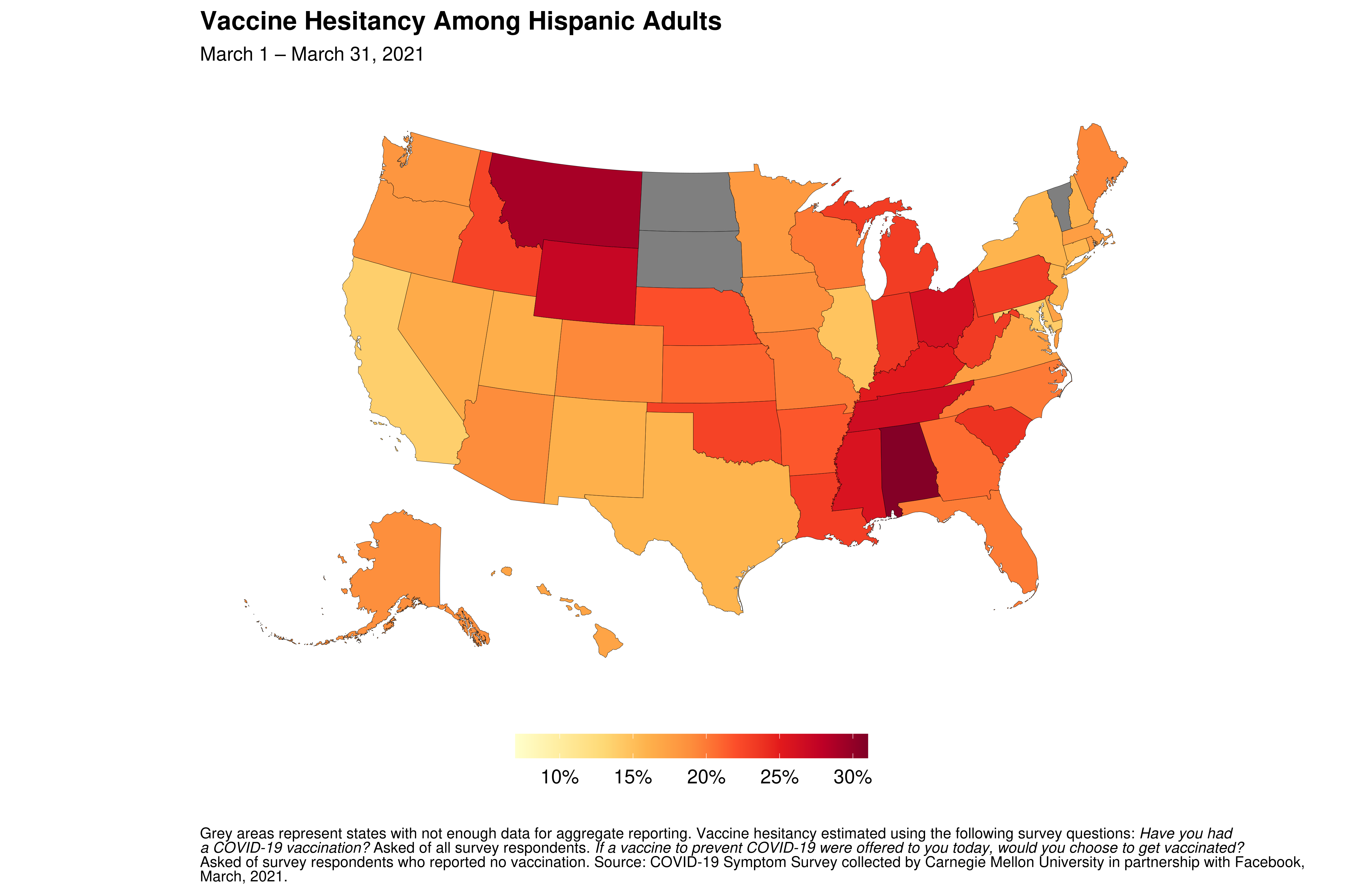 1. Vaccine hesitancy among Hispanic adults has significantly decreased nationally; however, it remains high in midwestern and southeastern states. Nationally, vaccine hesitancy among Hispanic adults has decreased significantly (by 9.2 percentage points) between January and March 2021. This is greater than the decline observed among non-Hispanic White adults (4.9 percentage points). However, there is still a large state-to-state difference in vaccine hesitancy among Hispanic adults, and vaccine hesitancy remains the highest in several states (e.g. Alabama, Montana, Tennessee, Wyoming, and Ohio).